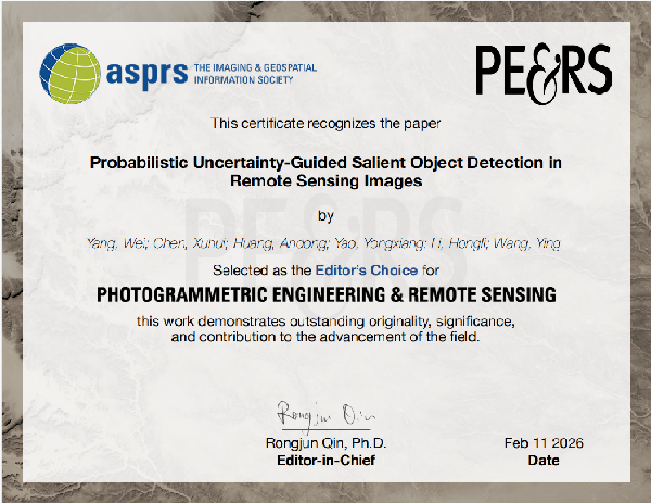 据悉,PERS作为美国摄影测量与遥感学会(ASPRS)的官方期刊,系中科院SCI四区期刊,2025年影响因子达1.96,在国际遥感领域具有较高权威性。其设立的编辑推荐奖,旨在表彰选题新颖、方法科学、兼具重要学术价值与应用价值的优秀论文,是对论文学术质量与研究价值的高度认可。