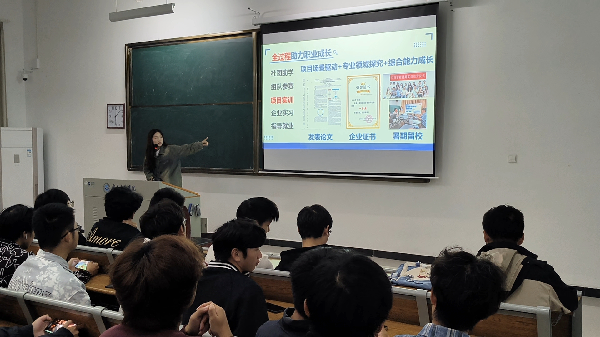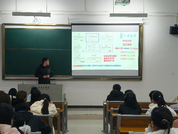 接着,宣讲师生介绍工作室打破专业、年级、课堂的局限,面向校内运营社团,面向校外运营企业,构建了"社团助学—岗前实训—顶岗实习—就业创业"的学生实践成长范式,学生从大一到大四紧密围绕项目需要进行跨学科学习、实训实习与分工协作,通过“干中学”最终成长为复合型、应用型、创新型人才。近年来,工作室百余名大学生形成就业优势,多名大学生获用人单位好评。