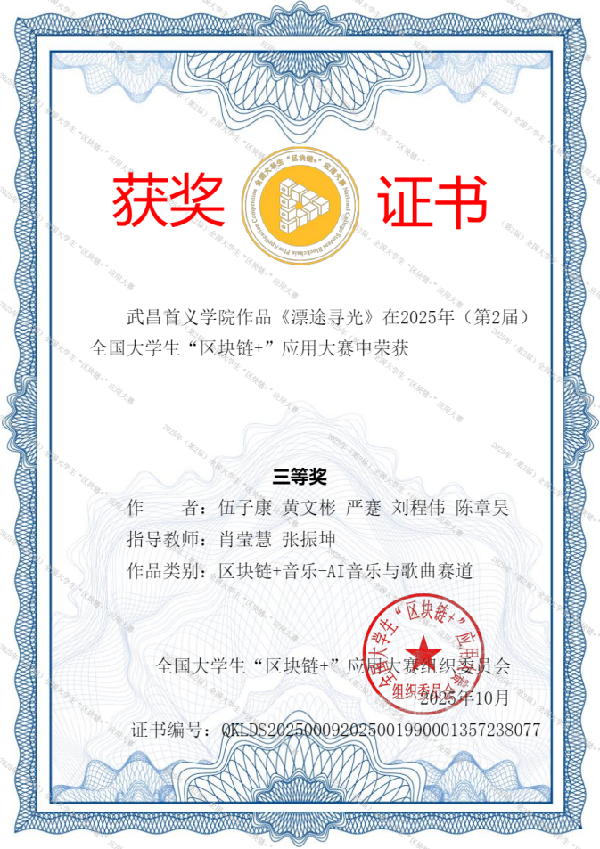 《漂途寻光》以AI辅助创作歌词与旋律,结合区块链版权保护,真实表达了北漂群体的内心世界,荣获“AI音乐与歌曲”赛道国赛三等奖。