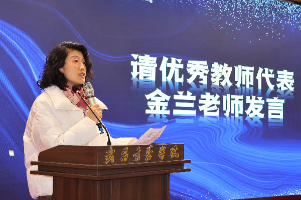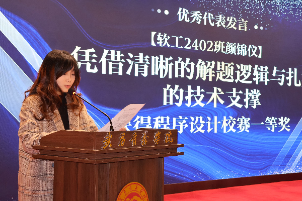 第四项优秀指导教师代表发言。作为第50届ICPC国际大学生程序设计竞赛亚洲区域赛(香港站)参赛队指导教师,金兰老师在发言中指出,学院组建的代表队凭借扎实的编程功底、娴熟的算法应用能力与默契的团队协作,在连续五个小时的高强度比拼中沉着应战、高效解题,最终脱颖而出,斩获国际级铜奖。这一成绩不仅实现了学校在ICPC赛事中的历史性突破,更位列民办高校首位,标志着武昌首义学院计算机编程教育水平跃升至新高度,彰显了学校在应用型人才培养领域的深厚积淀与卓越实力。
