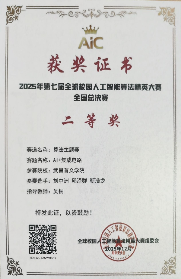 大赛特邀中国科学院院士、国际人工智能联合会理事会主席、南京大学人工智能学院院长周志华教授担任大赛科学顾问,汇聚了全国高校人工智能领域的精英团队,赛题聚焦前沿技术,涵盖智能算法优化、复杂场景应用等核心领域。由物联网专业学生刘中洲、邱泽群、靳浩龙组成的参赛队伍,在吴桐老师的悉心指导下,针对赛题要求,结合物联网技术特点,创新性优化算法模型,攻克了数据处理效率与精准度平衡的难题。在为期三天的激烈角逐中,团队成员分工明确、高效协作,通过多轮模拟演练与答辩打磨,最终以优异的表现征服评委,斩获殊荣。
