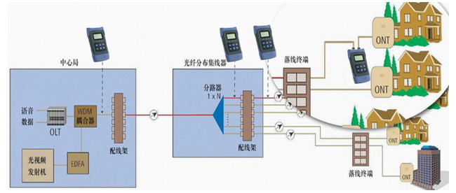 光接入实训基地主要围绕EPON的组网设计、工程施工、业务开通和测试、网络运维以及故障定位及排除等内容进行教学。光接入系统实训方案所需设备主要分为EPON接入网系统、EPON用户侧设备和网络侧设备系统以及光纤接入测试系统三个系统构成。建设方案既能体现中国电信和中国联通在近期和远期不同时期,城市和农村、新建和旧城改造不同接入市场的宽带光接入(见图1),又能体现中国广电HFC网络改造宽带接入(见图2),同时又能针对特殊场合下的宽带传输场合的应用。工程实施既能体现光纤接入网的建设规划内容和标准,同时又能体现光配线网的现场实施细节(见图3)。