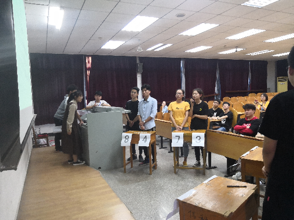 本次比赛分为动员大会、初赛和决赛三个阶段,历时近一个月。比赛采用分组的形式进行比拼,每个小组2个人,比赛过程中需要两个选手互相帮助。在经历了动员大会之后,就是我们的初赛,在选手们的激烈角逐之下,有八组优秀的选手脱颖而出晋级决赛。最终的决赛开前,每个小组的选手们都开始了自我介绍。比赛正式开始,赛程分为四个环节,活动形式多样,经过四个环节的激烈比拼选手们的以后就到了趣味横溢的互动环节,只要战胜擂台上的“战神”便能获得一份精美的礼品,台下的观众积极参与并取得胜利赢得了奖品。最终获得一等奖的是第一组:丁逸真、施慕琦,获得二等奖的是第三组:向秀灿、马昱堇,获得三等奖的是第五组:帅佳、竺斌辉,获得优秀奖的是第二组:桂斯铭、钟小虎和第六组:陈旭、汪敏以及第七组:陈诚、邹星赞,嘉宾给他们一一颁发奖状和奖品。此次大赛在阵阵掌声中圆满结束。