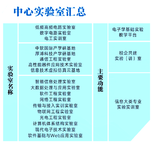 主要建成有面向全校工科专业的电子学基础实验教学平台、信息大类的专业实验实训室,还有多个校企联合实验室和校企合作共建实训基地。可同时容纳千余名学生进行实验、实训等各类实践性教学活动。全院共有45名专、兼职的“双师型”教师参与实验实践教学。每年都组织实验室人员进行专业技术和管理方面的培训,提升实验指导的水平和能力。实验室每学年共计承担60多万人学时的实验和实践教学工作,每年学生在大学生电子设计竞赛、中国大学生计算机设计大赛、全国大学生物联网设计竞赛等多学科竞赛和创新创业项目中都取得了较好的成绩。