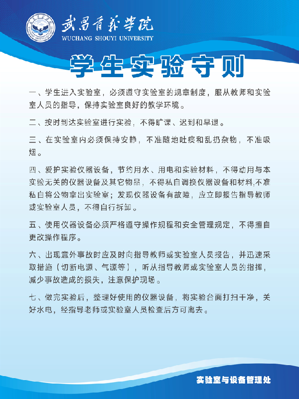 一、学生进入实验室,必须遵守实验室的规章制度,服从教师和实验室人员的指导,保持实验室良好的教学环境。