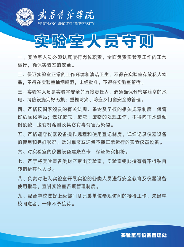 二、保证实验室正常的工作环境和清洁卫生,不得在实验室存放私人物品,不得在实验室抽烟喝酒,未经批准,不得在实验室留宿。