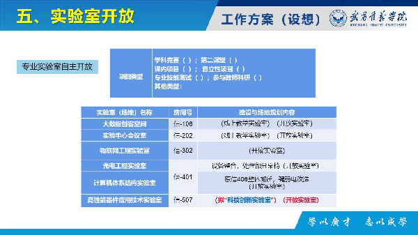 为鼓励和支持师生有效利用实验室资源积极开展实验教学和科研活动,培养学生科学精神、创新思维,提高学生实践应用能力,2022~2023学年将继续开放“大数据创客空间”“物联网工程实验室”“光电工程实验室”“计算机体系结构实验室”“高性能器件应用技术实验室”作为自主开放实验室,并将“高性能器件应用技术实验室”作为“科技创新实验室”,主要满足学生的学科竞赛、第二课堂、 创新创业项目、科学研究和素质训练等需求。同时,在保障正常实验教学的前提下,将积极探索面向全院学生开设开放性实验项目,供学生选修,鼓励学生积极选修开放性实验项目,以开阔视野,提高综合素质,提升学生创新应用能力。