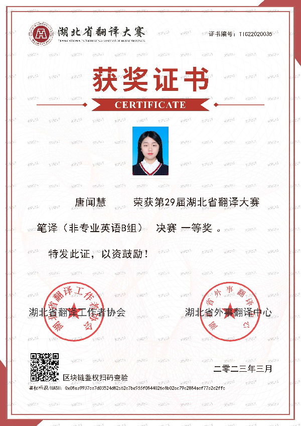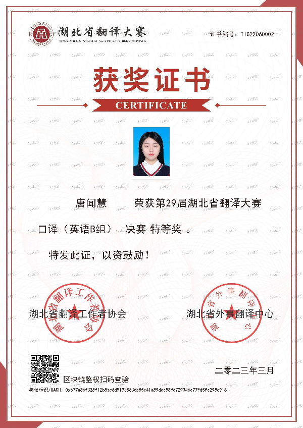 电信2002班唐闻慧同学在第二十九届湖北省翻译大赛决赛中荣获英语B组口译特等奖、英语B组笔译一等奖。请全院学生以此为榜样,踔厉奋发,笃行不怠,努力争做学习楷模,不断突破自我,努力成为具有社会责任感、基础知识牢、专业能力强、德智体美劳全面发展的高素质应用型优秀学子。