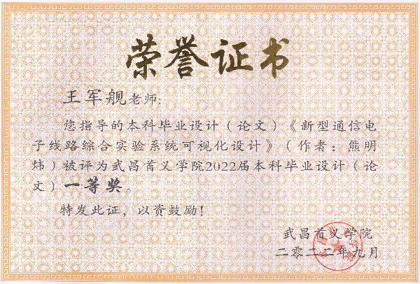 参与项目开发学生的毕业设计《新型通信电子线路综合实验系统可视化设计》、《基于嵌入式技术的通信系统DDS信号源设计》均获得校优秀毕业设计一等奖。