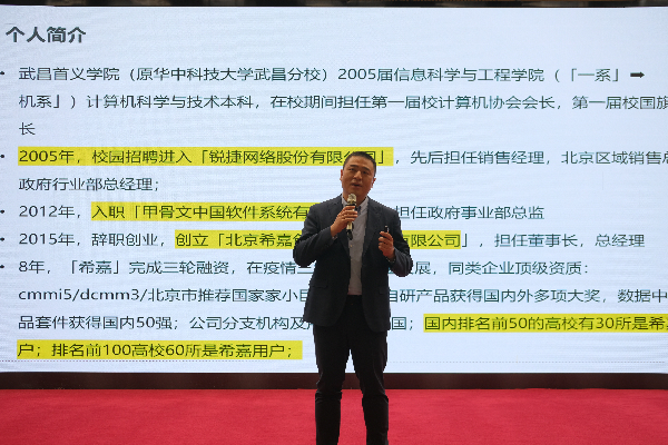 胡喆,2005年毕业于华中科技大学武昌分校计算机科学与技术专业,现北京大学国家发展研究院EMBA,北京希嘉创智教育科技有限公司创始人、董事长,武昌首义学院校友会副会长。胡喆先生辗转IT行业多年,有丰富的创业经验。他的企业成为中国数据中台50强企业,在教育行业数据中台及数据治理领域市场占有率领先,分支机构及业务覆盖全国各省。