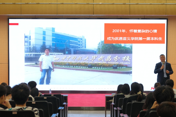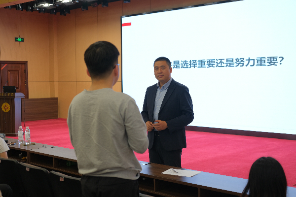 会议伊始,胡喆提出“人生是选择重要还是努力重要?”,与在场学生展开互动。计应2102帅宇杰认为选择是努力的先决条件“人生的大部分成就与财富是基于你的选择,选择时代风口,与时代同频才能更加容易获得成功”。胡喆围绕问题,将自身经历分为三个部分展开回答,分别是:大学生活、十年打工路及创业七年。他先用照片向同学们展示了他奋斗不止的大学生活,展示自己如何调整心态一步步攀登。在谈及十年打工路时,胡喆阐述了他的三次“放弃”,这三次经历让他参与了公司的成长,自己也收获颇丰。讲述七年创业史时,他提出“做减法远难于做加法,成功大多源于‘做减法’,失败大多因为‘做加法’”,其公司正是因为18年末在“繁荣”的市场中做“减法”,业绩才能在后来获得快速增长。他为同学们总结了三个建议:第一,大学四年是人生最宝贵的四年,这种既简单又成熟,既清纯又复杂的时光仅此一次,不要虚度,要珍惜;积极参加社团活动,奋力运动,努力学习;同时,珍惜“睡在你上铺的兄弟”。第二,不要追求公平,这是无能的表现;积极面对不公平,习惯面对不公平,在不公平中找到机遇,抓住他!第三,在职场拼到最后,拼的不是智慧,博的是身体与耐力,务必锻炼好身体。