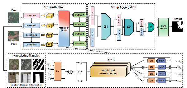 该成果面向智慧农业耕地智能监测应用场景,提出了交叉注意力引导的变化特征聚合网络(CAGNet),实现有效的农业耕地变化检测,并采用知识迁移策略有效提升了检测精度。实验结果表明在耕地数据集(CL-CD)上的定量指标结果优于其他十种基准方法,F1指标达到了79.53%。