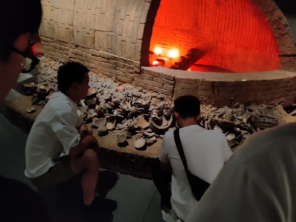 武汉博物馆二楼设有湖泗窑窑洞模型,小组成员有机会对湖泗窑的近距离观察,进一步加深了学生们对民窑的认识。在徐文发老师的逐步引领下,小组面对历史遗留的瓷瓦碎片讨论热情,引起一位经验丰富的湖泗窑爱好者关注,这位爱好者对湖泗窑瓷器的历史和特点了解颇丰,慷慨地与小组分享了许多宝贵的知识和经验,他的热情和知识为成员们的研究工作注入了新的动力,激发了组员们更深入地探索湖泗窑的热情。
