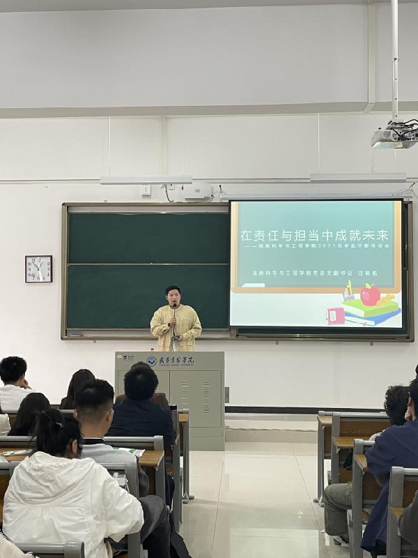 为促进新生尽快适应大学生活,进一步提高学生干部工作规范,明确我院学生工作方向,顺利开展下一步的阶段性工作。10月9日,信息科学与工程学院在嘉鱼校区教学楼A215教室召开新生系列教育——2023级学生干部培训会。会议由该院2023级年级负责人王战涛主持,学院党总支副书记汪晓航、分团委书记吴桐、2023级全体辅导员与各班级主要学生干部参加。汪晓航以《在责任与担当中成就未来》为主题展开,与学生干部共话高校学生干部如何快速成长。