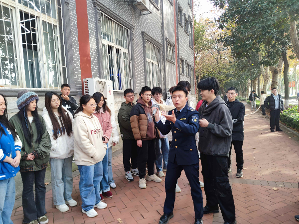 第二个项目是灭火器的正确使用方法及注意事项。在程教官的指导下,师生们实践了灭火器“提拔握压”的操作步骤,并亲自操作灭火练习。程教官强调了灭火安全距离应在2米以上和正确操作灭火器的重要性。