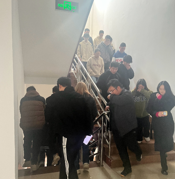 演练分为三个主要项目。第一个项目为模拟烟雾蔓延的火灾场景,通过在信息实验大楼内放置烟雾饼来考验参与者的紧急反应和逃生决策能力。随着警报器响起,师生们迅速按照预设的逃生路线疏散,采取了低姿势前行和用手肘捂口鼻等自救措施;他们还体验了消防小黑屋,切身感受到在火场中保持冷静并寻找逃生路径的重要性。消防指导员程教官全程指导,确保演练安全有效,并在活动结束后强调了逃生技巧和疏散路线的就近原则。