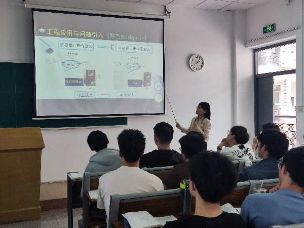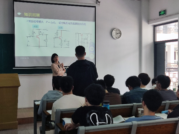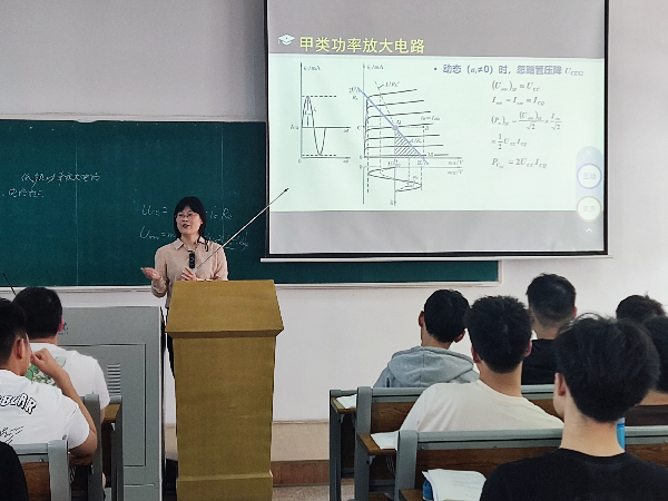 示范课由信息科学与工程学院蔡红娟副教授主讲,课程内容围绕模拟电子技术中的低频功率放大电路展开。蔡红娟老师凭借丰富的教学经验和深厚的理论功底,通过精心设计的教学课件、生动的实例分析和互动讨论,为学生们展示了一个个精彩的低频功率放大电路案例,使得难于理解的模电理论变得贴近生活、易于理解。在授课过程中,蔡红娟老师不仅讲解了低频功率放大电路的工作原理和设计过程,还将思政元素巧妙融入课程内容,起到了很好的效果。蔡老师强调,作为未来的工程师,学生们应秉持科技创新服务国家、造福人民的理念,将个人的技术追求与国家的发展需要紧密结合起来。