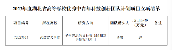 近日,省教育厅公布了2023年度湖北省高校优秀中青年科技创新团队计划项目立项名单,我院杨威老师牵头的视觉感知与智能计算团队成功获批,项目编号T2023045。创新团队成员包括王颖、阳威、刘智珺、王姣、端海旺、马玲、周向阳。