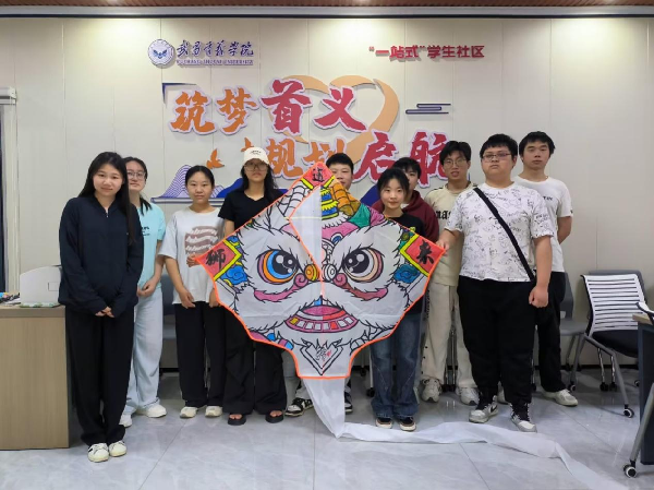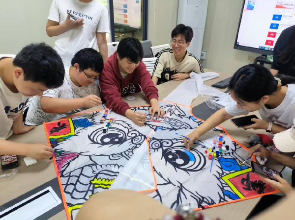 青年学子既保持着对传统纹样的敬畏之心,又融入数字化时代的创新表达,完成长了醒狮风筝的绘制。