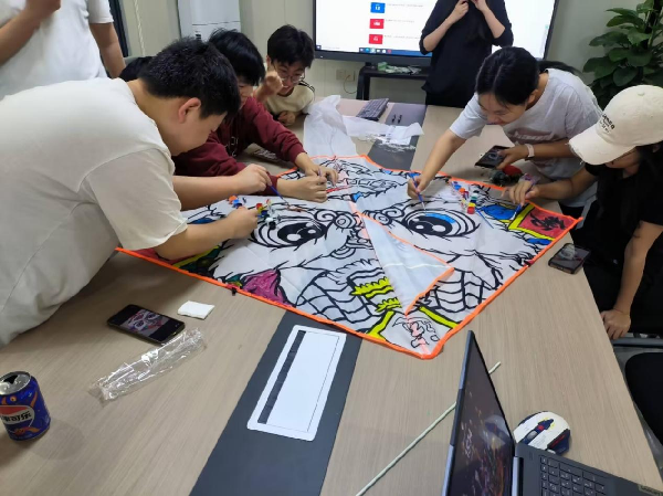 十人协作绘纸鸢环节将活动推向高潮。醒狮是中国传统文化中的重要象征,是中华民族精神的体现,这为“风筝”增添了特殊的文化内涵。在绘画过程中,同学们充分发挥了自己的创意和想象力。有人负责勾勒轮廓,有人负责填充颜色,还有人负责细节的修饰。大家分工合作,配合默契,整个过程充满了欢声笑语。
