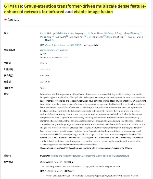 近日,我院视觉感知与智能计算团队在人工智能与计算机视觉领域取得积极进展,团队研究论文《GTMFuse: Group-Attention Transformer-DrivenMultiscale Dense Feature-Enhanced Network for Infrared and Visible Image Fusion》成功入选科睿唯安(Clarivate)全球“高被引论文”(Highly Cited Paper),杨威老师为该成果通讯作者。该荣誉仅授予同年度、同领域引用次数排名前1%的高水平论文,充分展示了该研究成果的国际学术影响力。