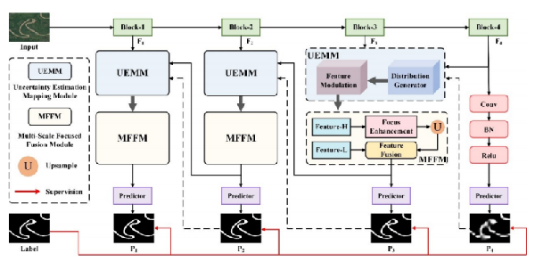 针对现有深度学习检测方法在光照变化、阴影干扰等场景下,易在物体与背景相似区域产生不确定性的问题,团队提出一种基于概率不确定性评估的遥感显著物体检测方法——不确定性引导网络(UGNet)。该网络通过四大创新模块实现性能跃升:一是设计具有深度监督的多尺度编码器-解码器框架,以高层次语义特征为先验指导,强化对混淆特征的区分能力,精准计算混淆特征的不确定性;二是构建不确定性估计映射模块,采用高斯分布对不确定像素进行加权处理,显著提升混淆区域的语义区分度;三是引入多尺度焦点融合模块,高效整合全局与局部信息,降低多尺度混淆特征的不确定性;四是通过多尺度深度监督,进一步提升显著物体检测的准确率。结果显示,UGNet在各项评价指标上均优于18种当前主流的显著物体检测方法,检测性能得到显著提升。