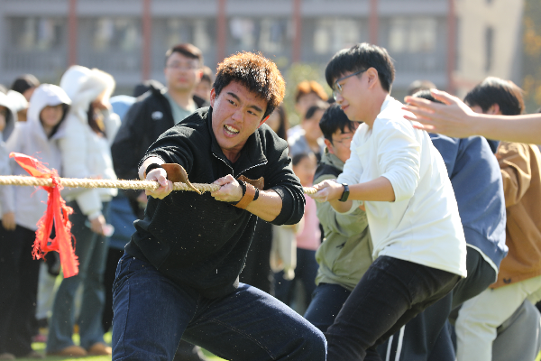 比赛中,参赛队员们紧握长绳、双脚蹬地,身体后倾形成整齐划一的发力姿态,一张张涨红的脸庞上写满坚毅,一声声整齐的呐喊响彻校园。绳子两端的队伍势均力敌,红绸带在中间来回拉锯,每一次移位都牵动着在场观众的心,加油声、欢呼声、鼓掌声此起彼伏,将比赛的紧张氛围推向一个又一个高潮。