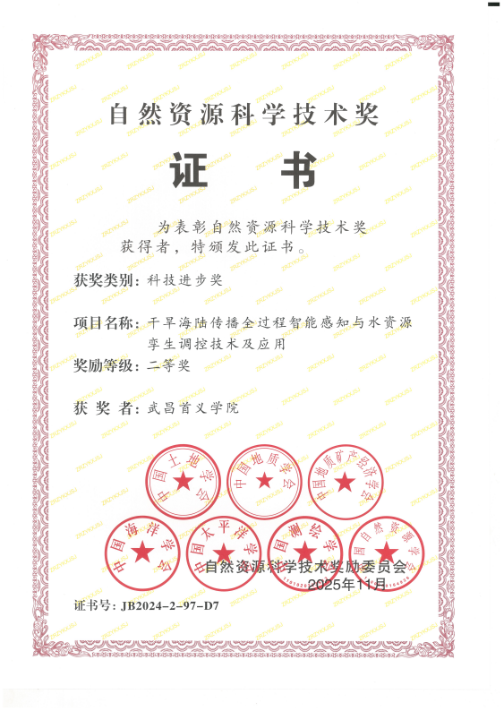 近日,2024年度自然资源科学技术奖评选结果正式公布,我校凭借科研项目《干旱海陆传播全过程智能感知与水资源孪生调控技术及应用》荣获“科技进步奖”二等奖。